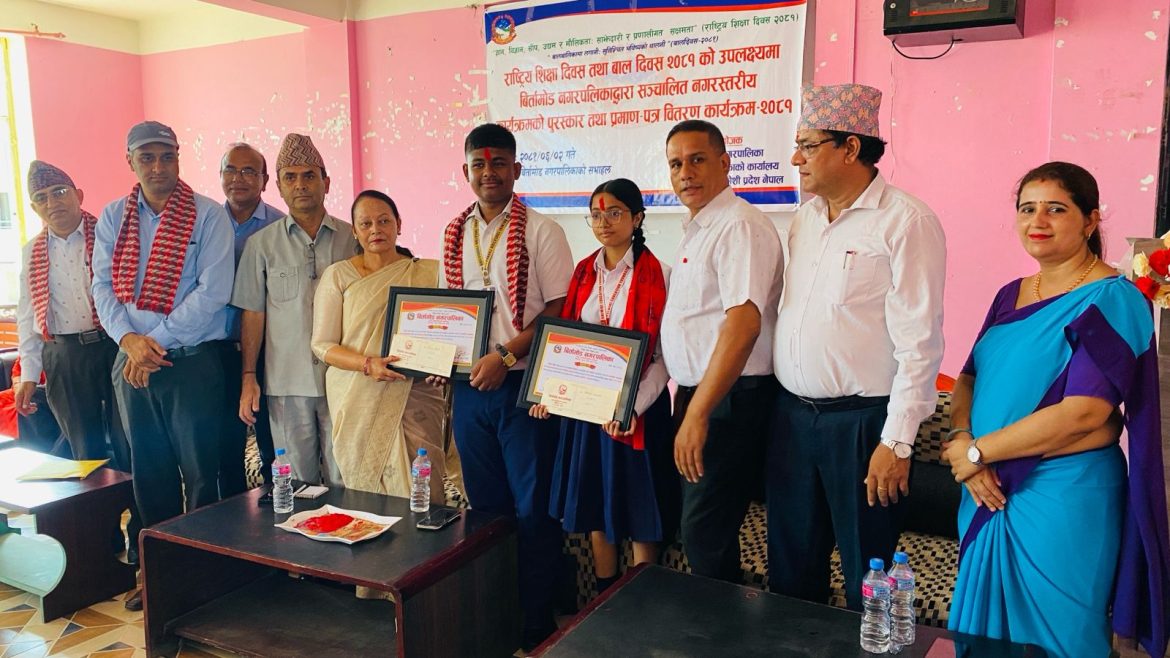 बिर्तामोड । बिर्तामोड नगरपालिकाले राष्ट्रिय शिक्षा दिवस तथा बाल दिवसको अवसरमा भदौ २९ गते आयोजना गरेको नगरस्तरीय वक्तृत्वकला प्रतियोगिताका विजेताहरुलाई पुरस्कार वितरण गरेको छ ।