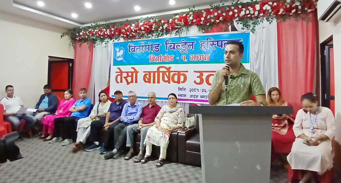 बिर्तामोड । बिर्तामोड-१ स्थित झापाको पहिलो बाल अस्पताल ‘बिर्तामोड चिल्ड्रेन हस्पिटल’ले झापाली पत्रकारहरुबीच आफ्नो तेस्रो स्थापना दिवस मनाएको छ । आफूहरुले दिँदै आएको सेवा सुविधाबारे जानकारी गराउँदै हस्पिटल परिवारले स्थापनाको तेस्रो वर्ष मनाएको हो ।