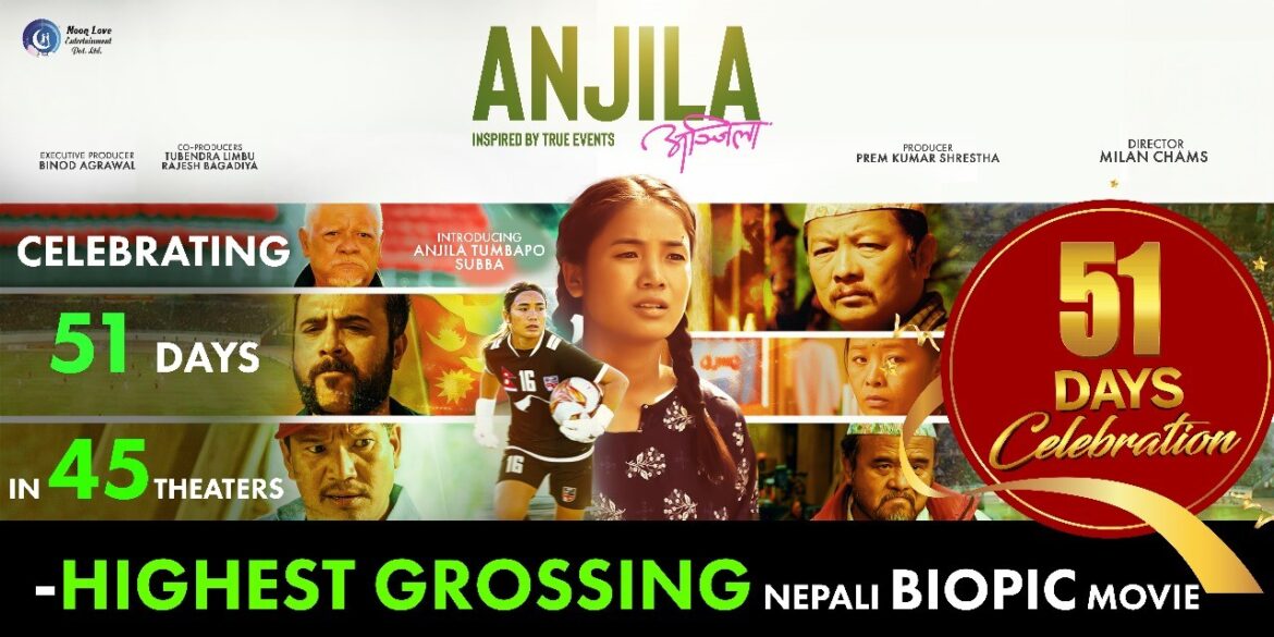 ‘अञ्जिला’को ५१ दिनसम्मको सफलताले नेपाली बायोपिकमा ऐतिहासिक कीर्तिमान बनाएको निर्देशक मिलन चाम्सले बताए। ‘हामी सफलताका साथ ५१ दिनमा पुगेका छौँ। ‘अञ्जिला’ नेपाली फिल्मको इतिहासमा १० करोड माथिको व्यापार र ५१ दिन पुग्ने पहिलो नेपाली बायोपिक फिल्म बनेको छ,’ निर्देशक चाम्सले भने।