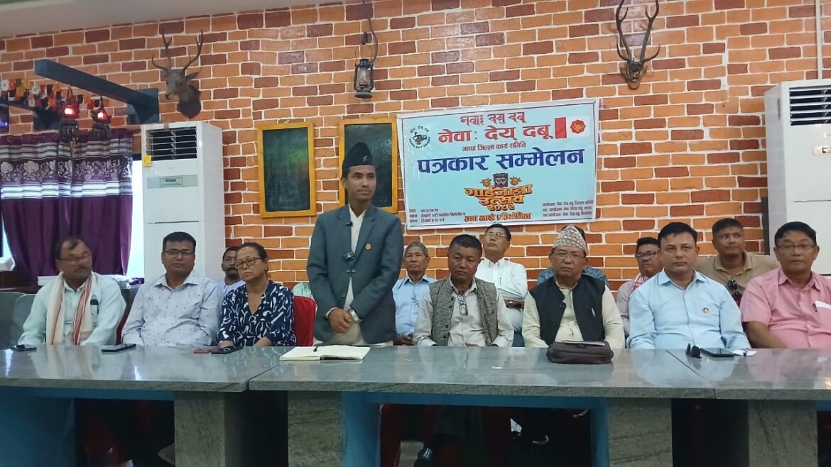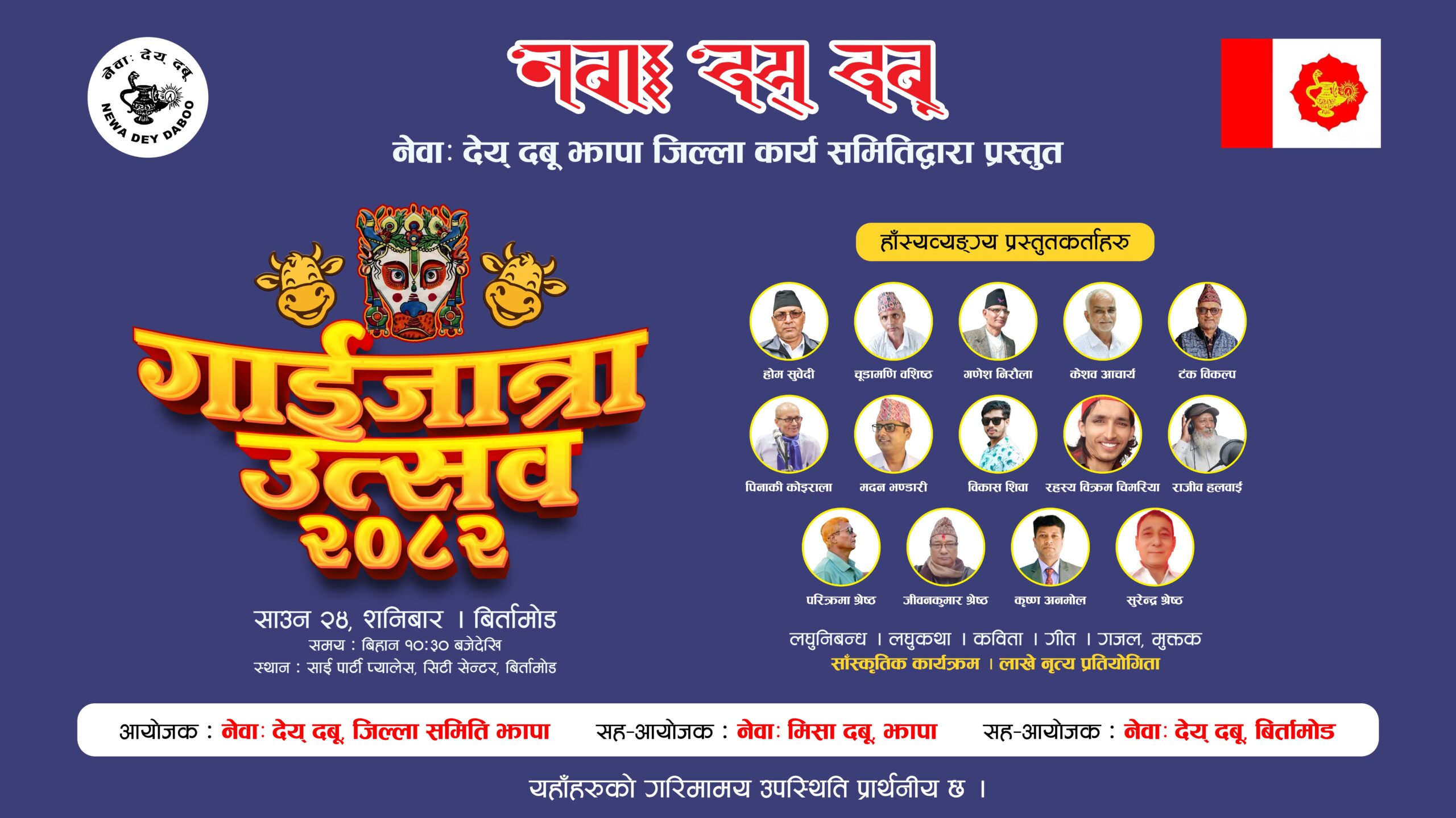 बिर्तामोड । झापामा पहिलो पटक नेवा: देय् दबू झापाको आयोजनामा हास्यव्यङ्ग्य प्रस्तुतिसहितको ‘गाईजात्रा उत्सव’ हुने भएको छ । बिर्तामोडमा बिहीबार पत्रकार सम्मेलन गरी आगामी साउन २४ गते गाईजात्रा उत्सवसँगै लाखे नृत्य प्रतियोगिता समेत हुने आयोजक संस्थाले जानकारी गराएको हो ।