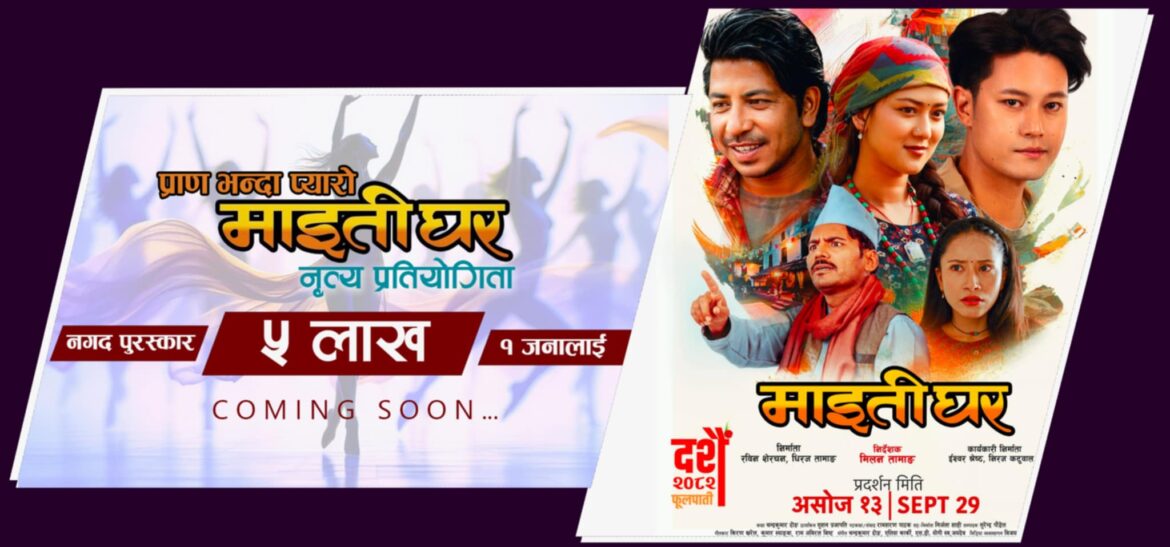 बिर्तामोड । चलचित्र ‘माइतीघर’ले आफ्नो टाइटल गीतमा ५ लाख पुरस्कारसहितको नृत्य प्रतियोगिता घोषणा गरेको छ । मिलन तामाङको निर्देशित यस फिल्मको प्रचारप्रसार गर्दै दर्शकमा उत्साह जगाउन यो प्रतियोगिता राखिएको निर्माण टिमले जनाएको छ ।