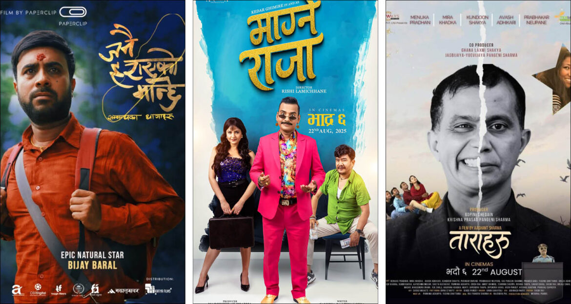 काठमाडौं । फ्राइडे रिलिज अन्तर्गत आज भदौ ६ गते शुक्रवारदेखि तीन नयाँ नेपाली फिल्महरु प्रदर्शनमा आएका छन् । आजदेखि देशका प्रायः सबै सिनेमा हलहरुमा ‘माग्ने राजा’, ‘जनै हराएको मान्छे’ तथा ‘ताराहरु’ प्रदर्शनमा आएका हुन् ।