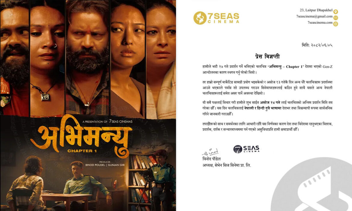 ‘हामीले भदौ २७ गते प्रदर्शन गर्ने भनिएको सिनेमा ‘अभिमन्यु : च्याप्टर १’ देशमा भएको जेनजी आन्दोलनका कारण स्थगन गर्नु परेको थियो । तर हाम्रो सम्पूर्ण मार्केटिङ सामग्री प्रयोग भइसकेको र असोज १३ गते अन्य तीन सिनेमा प्रदर्शनमा आउने भएकाले पर्याप्त शो उपलब्ध गराउन कठिन हुने साथै यसले अन्य नेपाली सिनेमालाई समेत असर पार्ने अवस्था देखियो । यी सबै पक्षलाई विचार गरी हामीले शुभसाइत असोज २४ गतेलाई अन्तिम प्रदर्शन मिति तय गरेका छौं । यस दिन सिनेमालाई नेपाली र हिन्दी दुवै भाषामा देशभर तथा विश्वव्यापी रूपमा सार्वजनिक गरिने जानकारी गराउछौं । तपाईंहरूको साथ र समर्थनका लागि आभारी रहँदै यस निर्णयका कारण देश तथा विदेशमा रहनुभएका वितरक, प्रदर्शक, दर्शक र सञ्चारमाध्यममा पर्न गएको असुविधाप्रति हामी क्षमाप्रार्थी छौं ।’