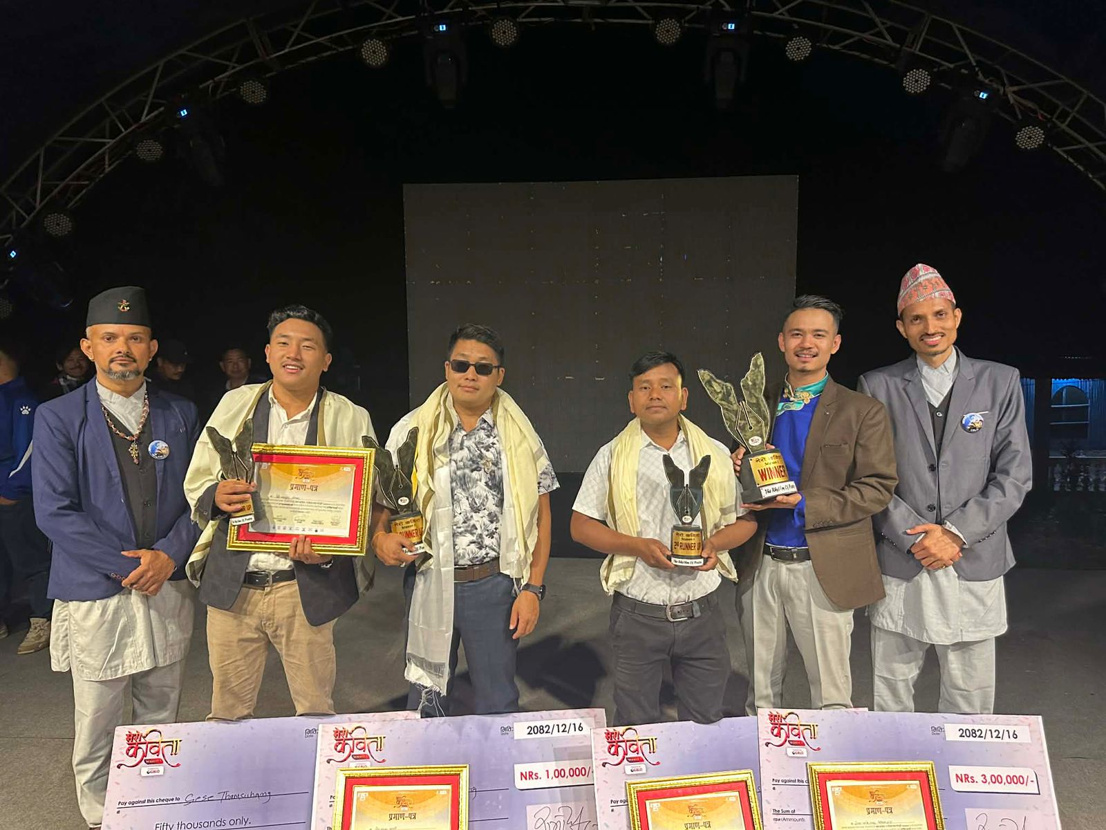 नेपाल प्रज्ञा प्रतिष्ठानका कुलपति भूपाल राईको प्रमुख आतिथ्यमा सोमबार सम्पन्न ग्रान्ड फिनालेमा क्रमश: सुनसरीका प्रवेग हाङसोराङ उपविजेता बन्दै नगद १ लाख रुपैयाँ र झापाका कवि टोलीप्रसाद राजवंशी सेकेन्ड रनरअपका रुपमा ७५ हजार रुपैयाँसहित पुरस्कृत भएका छन् । त्यस्तै फिदिमका कवि शेशे थाम्सुहाङ थर्ड रअनरप बनेका छन् । उनले ५० हजार रुपैयाँ नगद प्राप्त गरेको ग्लोबल भुटनिज लिटरेचर अर्गनाइजेसन (GBLO)का अध्यक्ष पातलो अन्तरेले जानकारी दिएका छन् ।